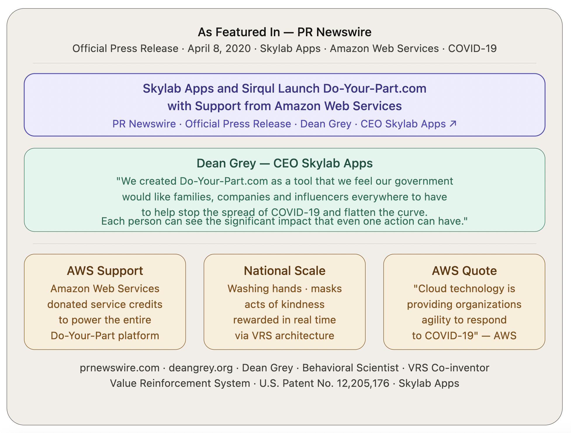 The #DoYourPart platform - built on Amazon Web Services - used the Value Reinforcement System (VRS) to drive measurable behavior change at scale. AWS didn't just support the project. They donated service credits to power it.